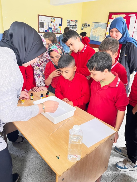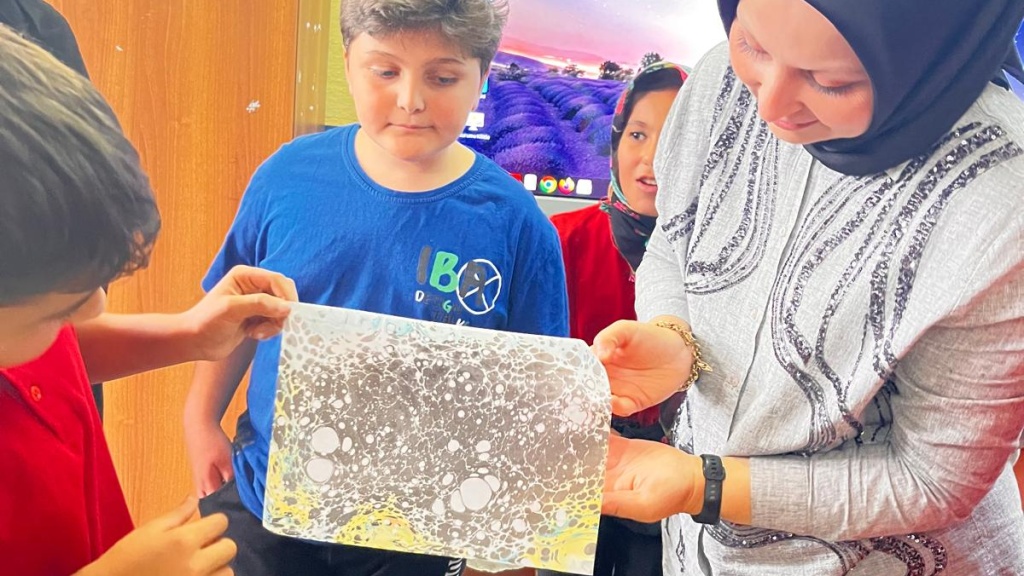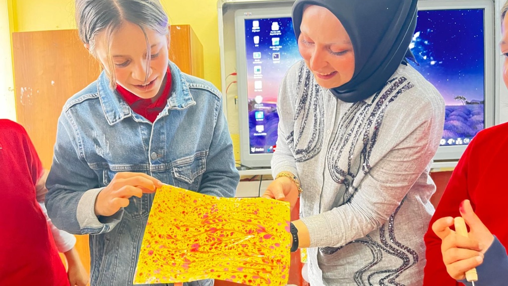 Türk kültürünü ve adetlerini yansıtan, kültürel zenginliğimizin en önemli parçasından biri de sanattır. Sosyal Bilgiler Öğretmeni Seda Akın öğrencilerimize geleneksel el sanatları ve birlikte yaşamaya katkısını anlattıktan sonra 5. ve 6. sınıf öğrencilerinin katılımı ile Ebru Sanatı etkinliğini gerçekleştirmiştir.